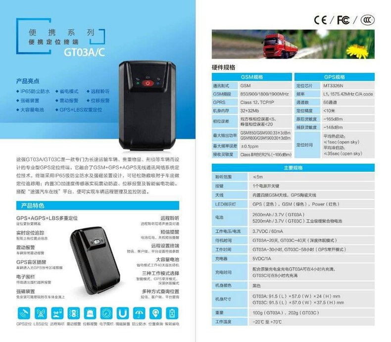 无线GPS定位器简单介绍: 无线GPS定位器两种模式可实现随时切换,分为闹钟模式和追踪模式,闹钟模式是指每天有固定的时间上报,追踪模式是指连续上报。该产品在闹钟模式下的待机时间可超过1000天,强磁装置,不用可以安装,质量可靠。